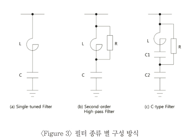 | 효과적인 고조파 흡수를 위하여 일반적으로 한개 차수 이상의 필터를 설치하며, 이는 발생되는 고조파 차수 및 전류량에 따라 선택 됩니다. 가장 일반적으로 적용되는 방식은 콘덴서와 리액터로 구성된 단일 동조 필터(Single-runed filter) 입니다. (주로 적용되는 필터 종류 별 결선방식은 Figure 3을 찹조하시기 바랍니다.) 필터 형태는 계통 고조파 해석에 기초하여 선정하게 됩니다. 삼화콘덴서는 계통 고조파 해석, 필터 설계, 제작 및 시운전과 관련하여 다양한 경험을 가지고 있습니다. 또한, 계통 해석을 위한 최신 해석 프로그램들을 보유하고 있으므로, 빠르고 정확하게 최적의 솔루션을 제공할 수 있습니다. |