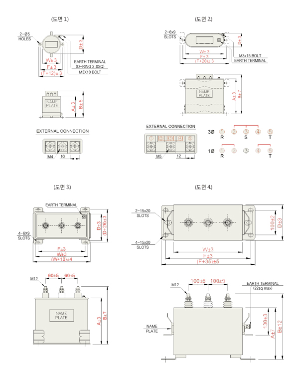 • 380V 60Hz 회로용 1Ø, 3Ø, 1/3Ø 콘덴서 정격 치수